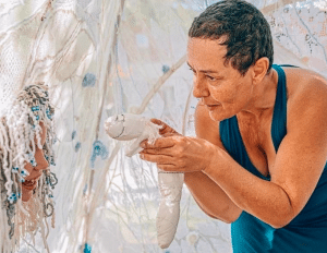 Amante de découvertes, de dialogues et de partages, Sandrine crée dans un esprit de «mieux vivre ensemble», pour des espaces ouverts et démocratiques, intérieurs ou extérieurs, ruraux ou urbains. Elle imagine et construit des univers expérientiels et interactifs. Le public peut habiter ses œuvres et les manipuler à son goût. Dans l’espace public, par le truchement de ses installations immersives, elle improvise autour des émotions, des rythmes et des langages corporels. Sa pratique artistique s’inscrit à la fois dans la rue et au cœur des milieux communautaires et sanitaires. Sandrine est née en Bretagne, vit au Québec (Charlevoix) depuis trente ans et voyage son art à travers le monde depuis une quarantaine d’années. Formée au conservatoire, diplômée en psychologie et en éducation, elle abandonne, dans sa vingtaine, le carcan de la danse et de la musique classiques au profit des contretemps des folklores africains (danses, percussions, gospel) et des arts clownesques. Aujourd’hui, travaillant essentiellement avec des matériaux et des textiles récupérés, elle conçoit et construit ses marionnettes, masques, costumes et scénographies.